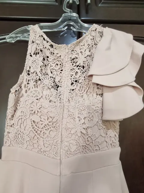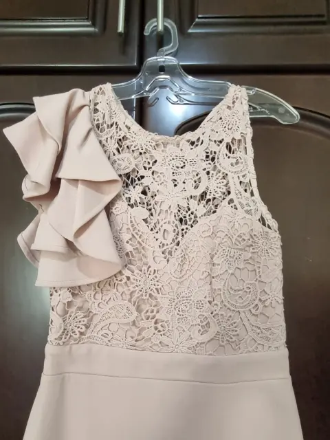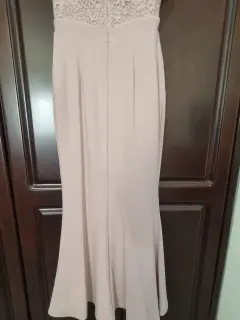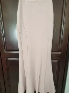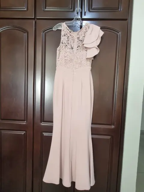 Vestido de noche color rosa palo talla chica, ceñido al cuerpo con olan en manga, largo y con cierre en espalda.