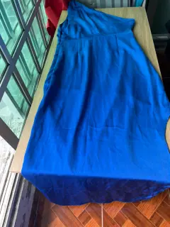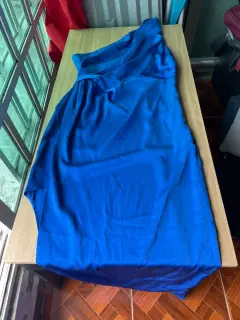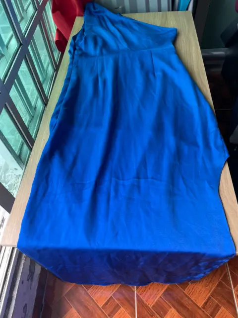 Hermoso, vestido en color azul eléctrico de un hombro al frente pliegues en el pecho. Es largo con abertura en la pierna derecha. Sólo se usó una vez, pero por el uso se huyó un poquito en las imágenes. Está el detalle.