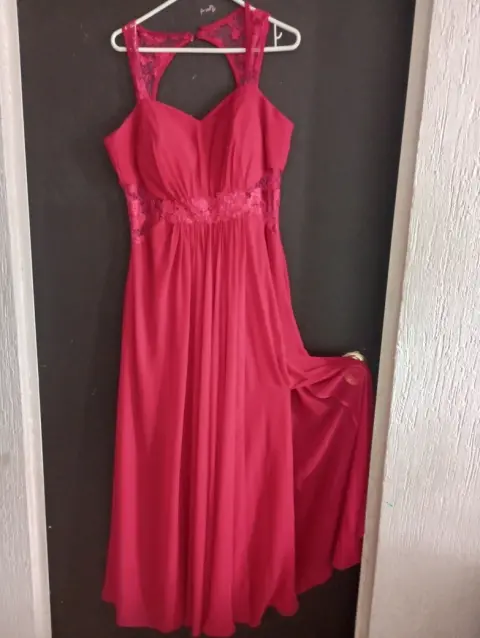 Vestido para fiesta de noche color rojo con abertura de la pierna izquierda y aplicaciones transparentes de los lados de la cintura talla grande , comprado en México en liverpool