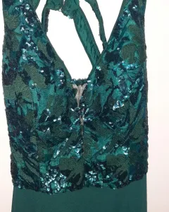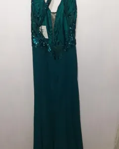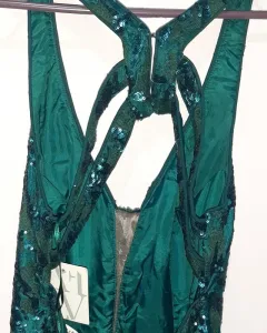 Vestido de noche para graduación o boda, la espalda tiene un escote y la cola es un poco larga, la parte de arriba cuenta con lentejuelas y con forro por dentro.
