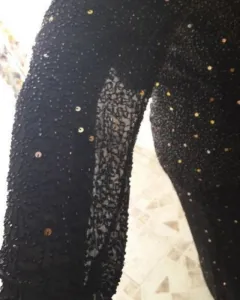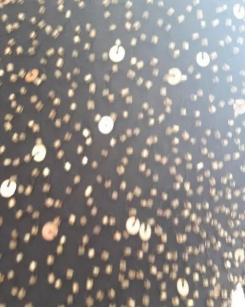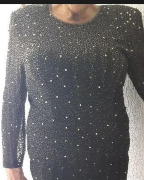 Vestido largo con abertura en pierna izquierda , hecho con telas de la India, transparencia en brazos, composición de chaquira y lentejuelaTalla reducida a L aproximadamente Medidas: Talla 14