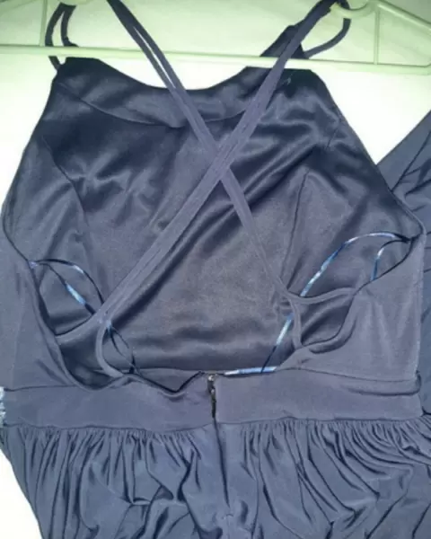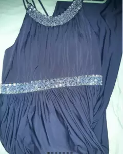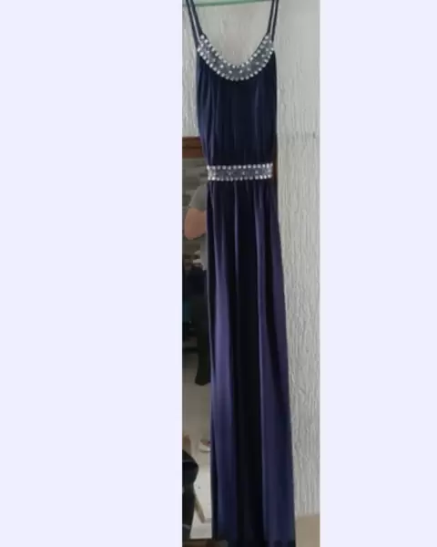 Vestido largo de noche.Talla 9De tirantes, cruzado en espalda.Color azul marino.Detalles de piedras en cuello y cintura.