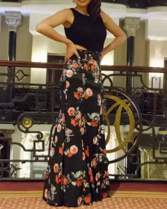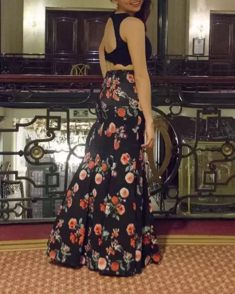 Vetido de noche Una sola pieza top en color negro falda floreado, talla xs, en excelentes condiciones.