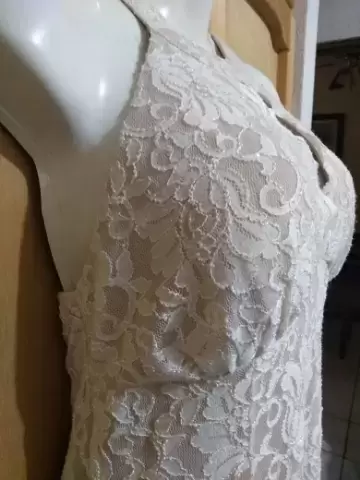 Vestido de fiesta largo Halter color beige con destellos brillantes. Se ajusta al cuerpo talla 12P. Mex talla M.