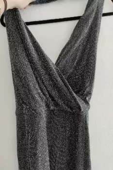VESTIDO DE NOCHE BRILLOSO. Vestido de noche metálico grid halter con espalda casi toda abierta