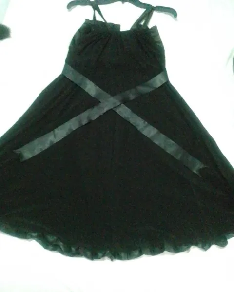 Vestido de noche con listón. Vestido de noche color negro, plieges en el pecho y liso abajo, tiene un adorno en la parte de la pecho la cinta como la parte de abajo tiene listón negro sin imperfecciones