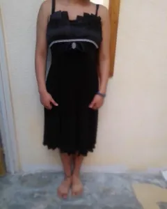 Vestido de noche color negro, plieges en el pecho y liso abajo, tiene un adorno en la parte de la pecho la cinta como la parte de abajo tiene listón negro sin imperfecciones