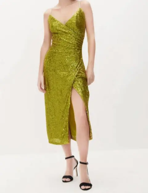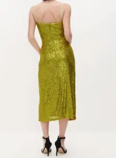 Vestido de noche de lentejuelas color verde Nuevo a estrenar con etiqueta, Talla 2 queda a talla S máximo talla M, la tela estira
