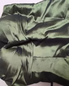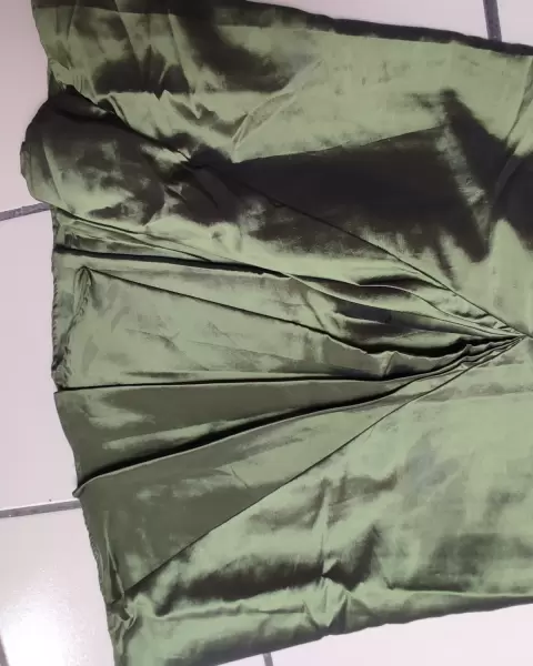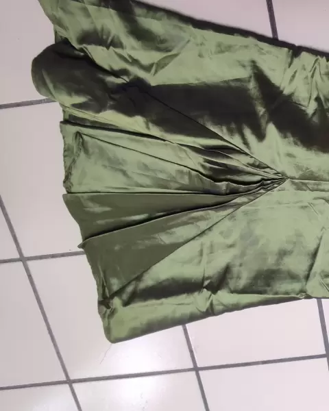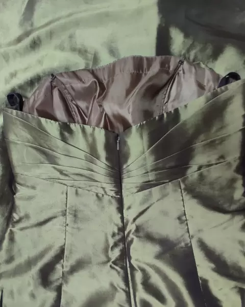 Vestido verde 100% poliester talla grande, 12, con drappeado Al frente en el pecho, cierre en la espalda, varillas a los lados, para mejorar la figura, copas, pegado hasta abajo, en la parte de atras tiene una cola pequeña, strapless