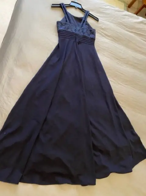 Vestido de noche talla 5 Anntonela azul noche. Vestido de fiesta talla 5 en color azul de noche , cuello redondo , aplicación de encaje perfectas condiciones