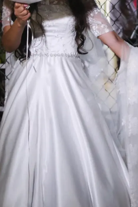Vestido de novia blanco, tela satin en la parte de abajo, y bordado a mano en la parte de arriba, con bolsitas a los lados, y manga 3/4, incluye crinolina, y encaje en toda la cola, con opción de subirse y dar vista de abanico