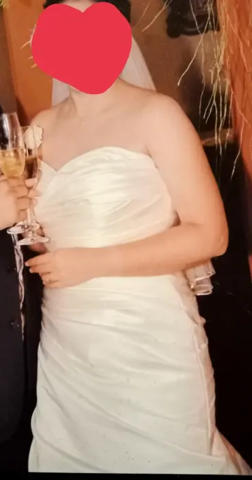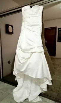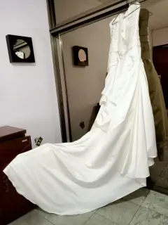 Es un vestido de novia, color Ivory, en excelentes condiciones, limpio, talla 12, ajustable, tiene crinolina y cola, tiene mangas que se desmontan para ser strapless.