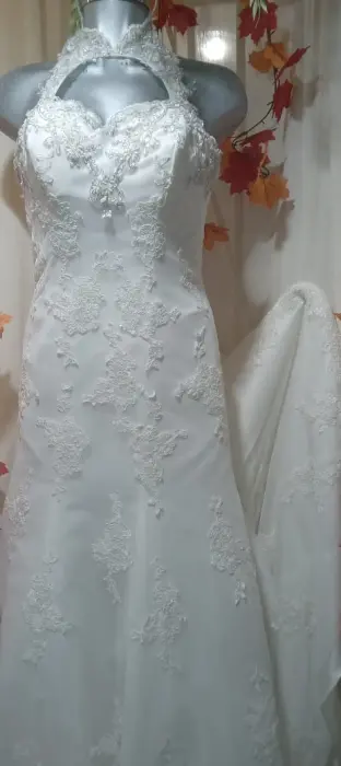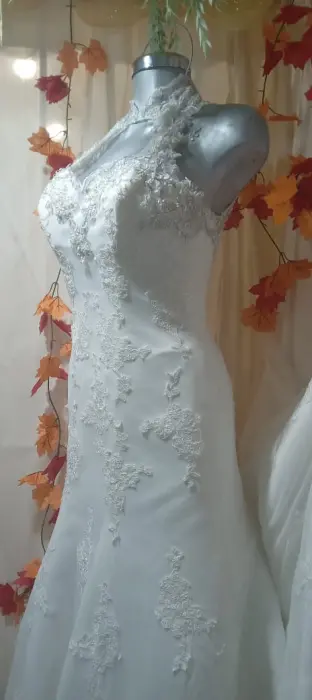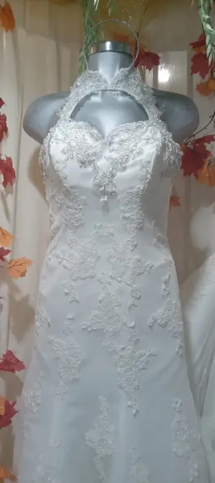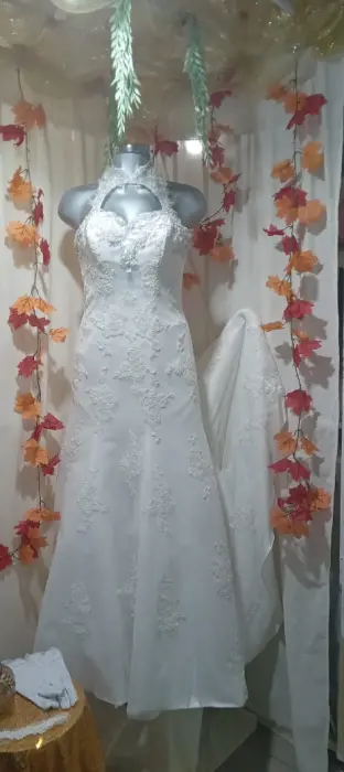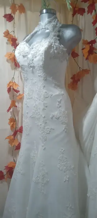 Precioso vestido de novia de swgundo uso, en excelentes condiciones, cuello halter, con una abertura hacia llegar a un escote corazón, precioso encaje, corte A. Talla M. AjustableLleva cauda