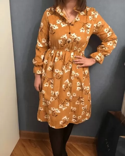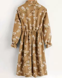 Vestido de pana floreado. La tela es gruesa, excelente paracel frío. Llega abajo de la rodilla, tiene botones en la parte delantera y resorte en las mangas.