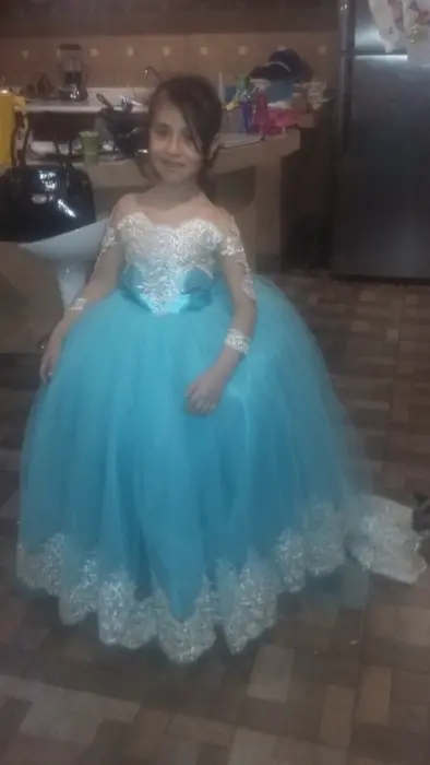 Vestido de Princesa Lya. Vestido color menta talla 6-8, excelentes condiciones, capa superior larga, acabados y detalles en dorado, botones en la parte superior trasera con corset