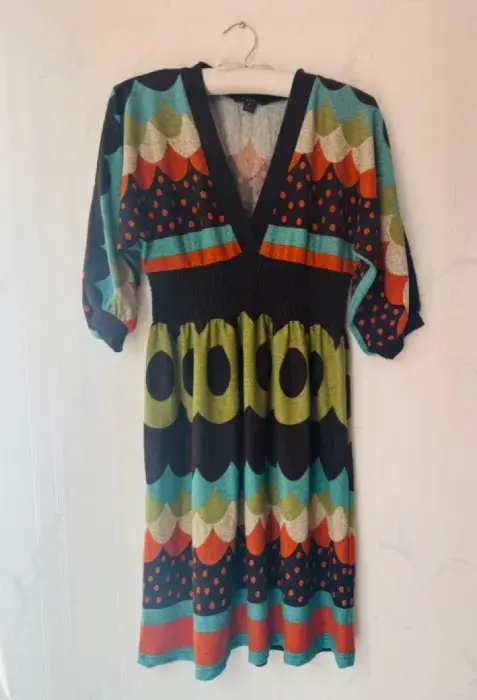 Los vestidos de punto se pueden usar de muchas formas!! Muy bonito vestido de punto en combinación de colores a fines. Usado una sola vez. Sin detalles. Lo puedes usar con unas lindas botas de tacón y agregar una bufanda con estilo bohemio. Marca cintura ya que tiene elástico. Muy cómodo. Más opciones en mi clóset. Perfecto para el otoño.
