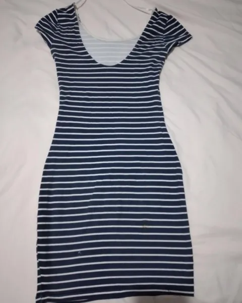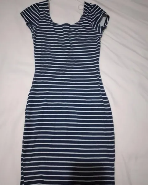 Hermos vestido de licra azul con rayas blancas en excelente calidad, solo se uso 2 veces sin ningún detalle.