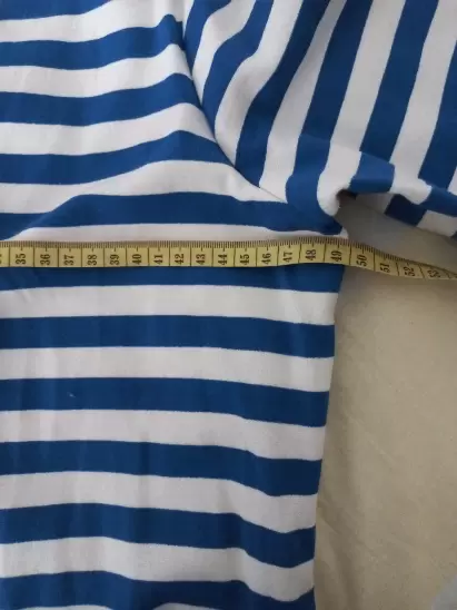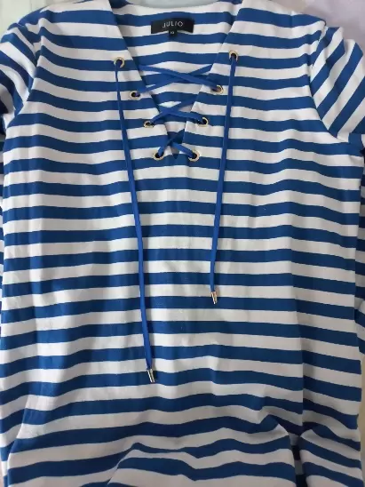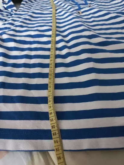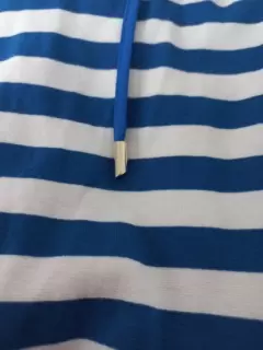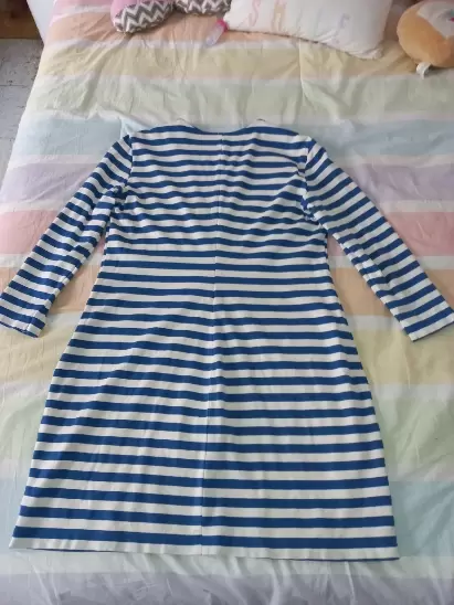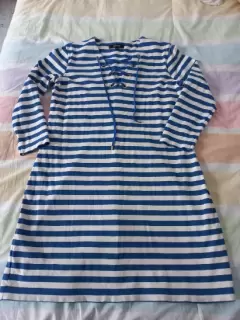 Vestido de rayas casual. Hermoso vestido corto con manga 3/4, doble color azul rey y blanco con detalles en dorado que lo hacen lucir elegante. Las medidas las encuentras en las fotos. Tiene ligero detalle de uso en la manga pero no se ve puesto. Es de una tela un poco stretch. Talla 10. Sin detalles.