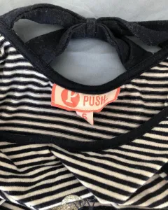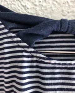 Vestido de rayas, motivos marinos. Vestido de rayas azul, motivos marinos, con nudo en la espalda, falda blanca, talla 5-6