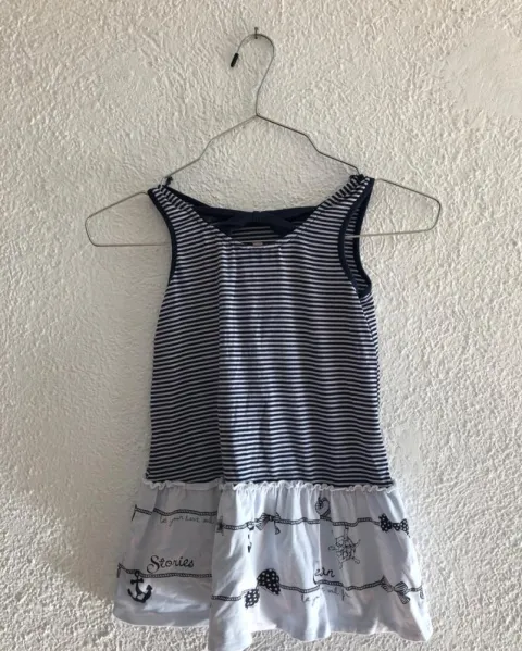 Vestido de rayas azul, motivos marinos, con nudo en la espalda, falda blanca, talla 5-6