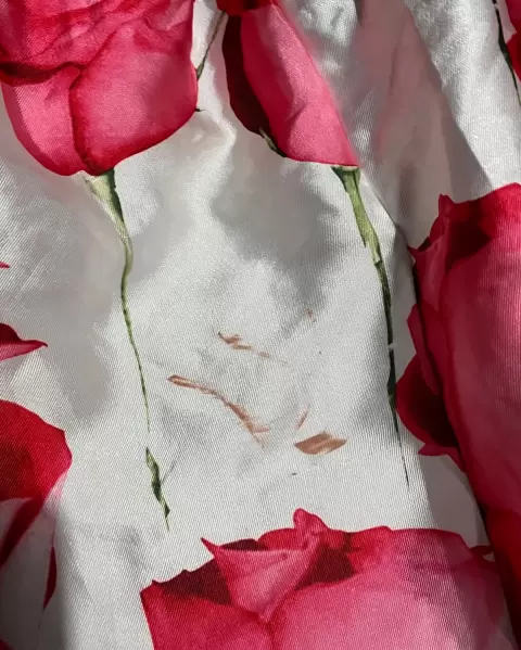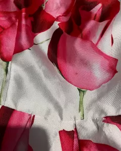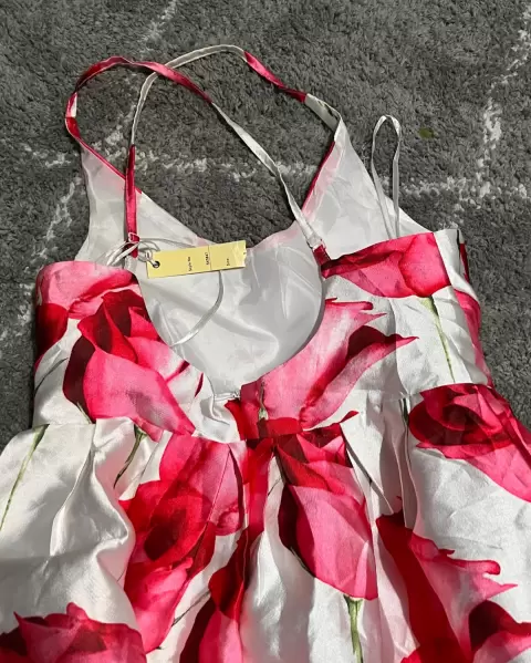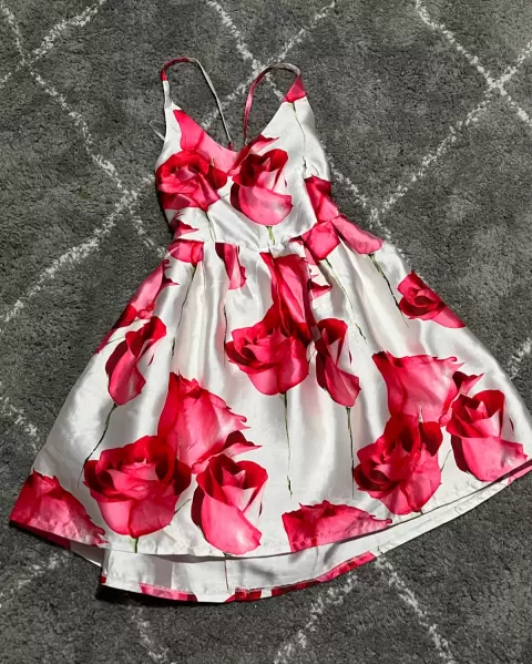 Hermoso vestido con vuelo blanco con estampado de rosas rojas. De tirantes. Tiene unas manchitas que se muestran en las fotos. Hermoso 🤩. Medidas ax a ax 45 cm, cintura 37 cm, largo desde la cintura 46 cm.