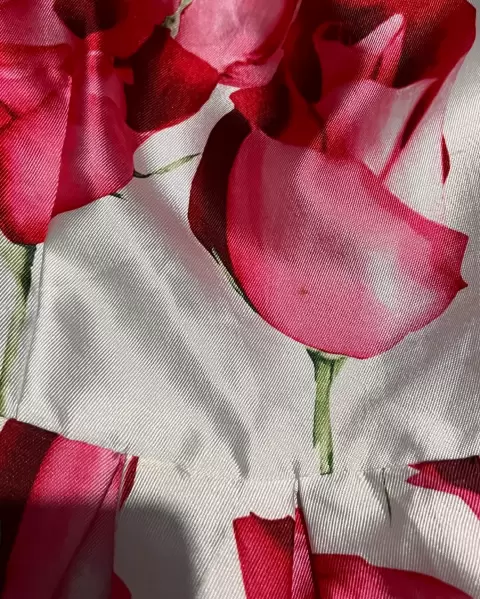 Vestido de tirantes. Hermoso vestido con vuelo blanco con estampado de rosas rojas. De tirantes. Tiene unas manchitas que se muestran en las fotos. Hermoso 🤩. Medidas ax a ax 45 cm, cintura 37 cm, largo desde la cintura 46 cm.