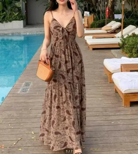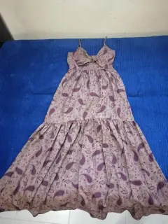 Vestido de verano talla mediana en la etiqueta pero viene reducido por lo que es mas para una persona delgada de talla chica En color café con adornos em vino, además viene con forro. Es muy fresco y original