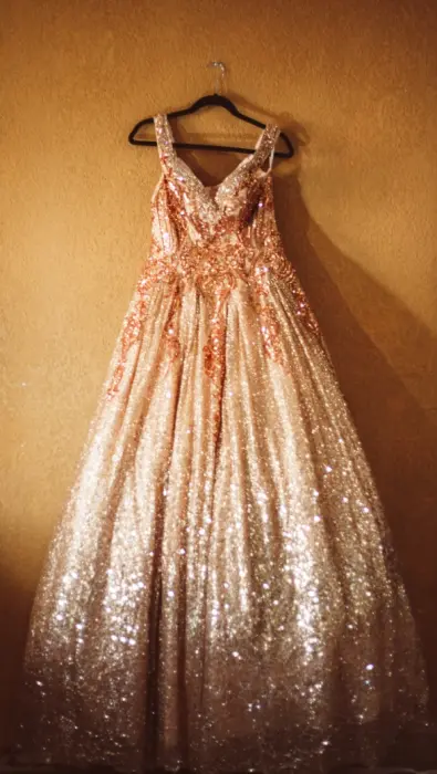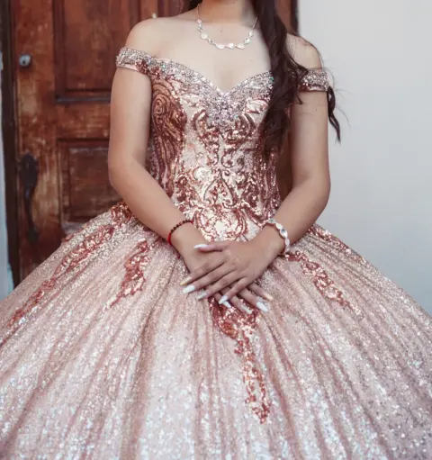 Vestido de xv. Vestido talla M, en perfecto estado, un vestido muy bello, incluido con crinolina.Tiene destellos dorados y plateados al final del vestido, el color que más predomina en el es el oro rosado.