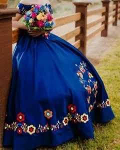 Vestido de xv años. Vestido de xv años de color azul con bordados de flores.