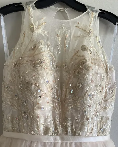 Hermoso vestido beige puesto solo un rato con brillo en la parte del corset tiene tipo crinolina para hacer un poco mas ampon