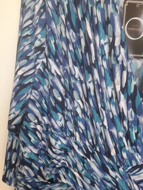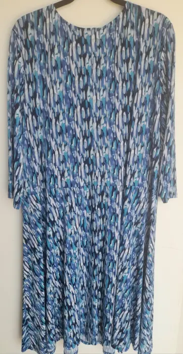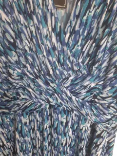 Vestido dibujos formal. Talla 2x , con un simulado cinturón que cubre cintura y cadera, escote profundo . Bastante vuelo en la falda. Manga tres cuartos. Hombros: 44cmAxilas :58 cm. Pero la tela es spandexLargo: 115 cm