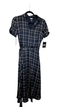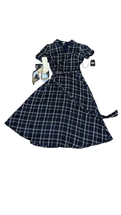 Vestido Camisero DKNY de Cuadros - Estilo Casual y EleganteEste vestido camisero de DKNY en un elegante patrón de cuadros es la prenda perfecta para un look casual con un toque sofisticado. Con un corte cruzado y cinturón ajustable, estiliza la figura mientras que el diseño de mangas cortas añade comodidad y versatilidad.Marca: DKNY.Corte: Cruzado con cinturón ajustable para realzar la cintura.Talla: 6Ideal para el día a día o para una salida casual elegante.Este vestido es la elección perfecta para quienes buscan un estilo chic y cómodo, ideal para múltiples ocasiones. ¡No te quedes sin él!