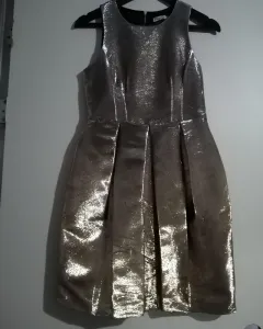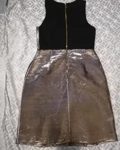 Bonito vestido Dorado tela tipo strech en la espalda con cierra y tablones k dan muy bonita forma queda arriba de rodilla parecido ala última foto