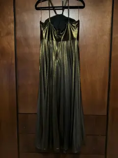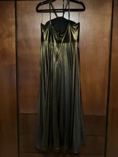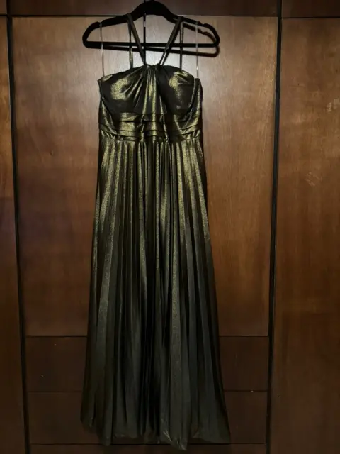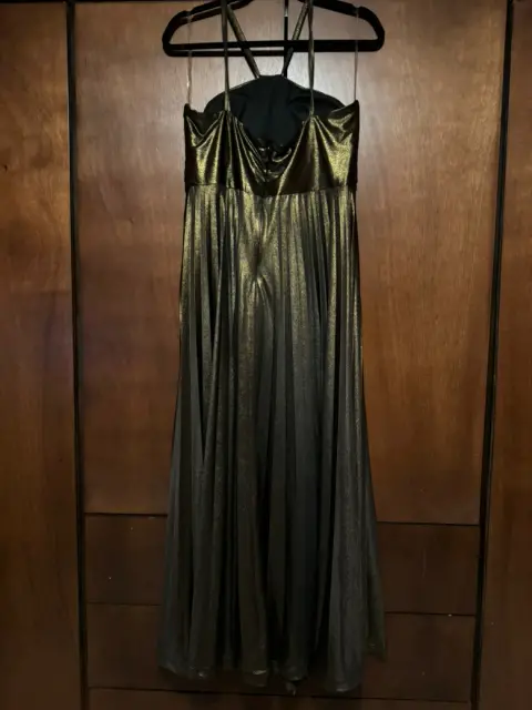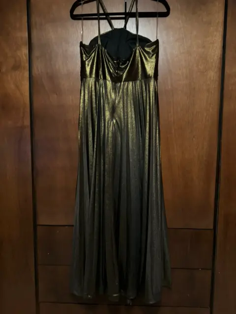 Vestido de una sola puesta, color dorado de Liz Minelli, Talla: Grande, tirantes, largo.