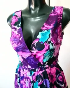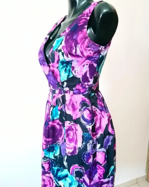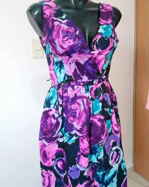 Vestido floreado en tonos morados es corto en colores hermosos, cuello V cruzado, ziper lateral, en perfecto estado. 43 axila a axila, 36 cintura, 97 largo. Marcado con talla 4
