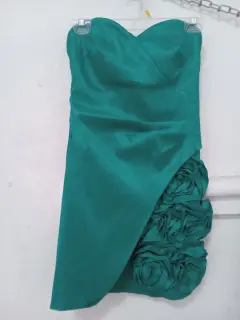 Lindo vestido brilloso decorado con fiuras de rosas en tafeta, misma tela que el resto del vestido. Las rosas están en la parte frontal de vestido, parte de abajo y leve plisado horizontal a la altura de la cintura.