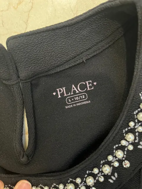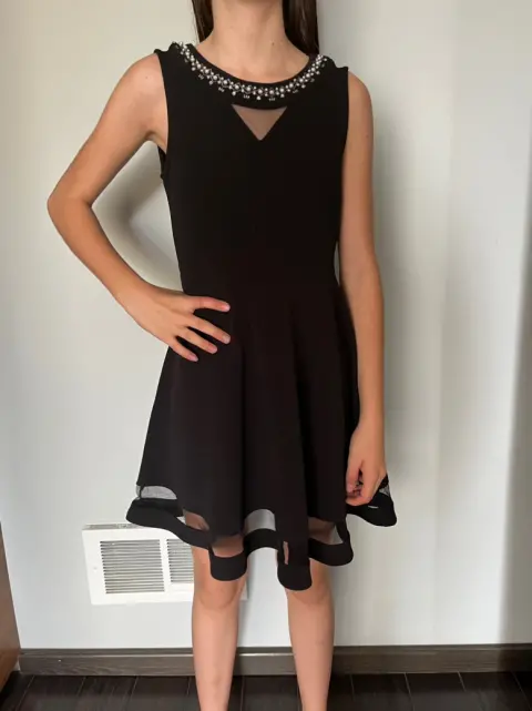 Vestido elegante de niña. Hermoso vestido negro súper elegante con collar de perlas Abertura en v en gasa Y la parte de abajo también con abertura de gasa negra Talla 10/12 Esta nuevo