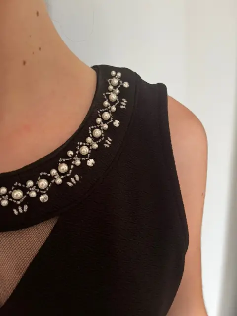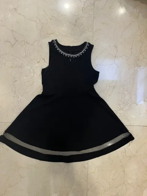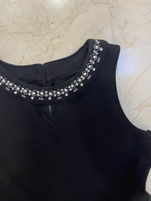 Hermoso vestido negro súper elegante con collar de perlas Abertura en v en gasa Y la parte de abajo también con abertura de gasa negra Talla 10/12 Esta nuevo