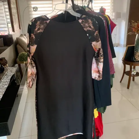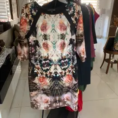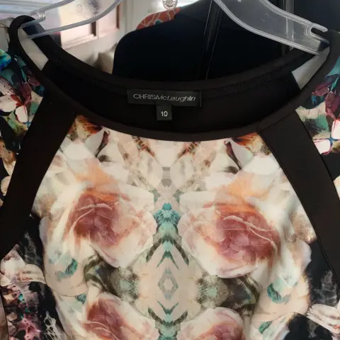 Vestido elegante flores. Vestido talla 10 marca Chris Mclaughlin, talla 10, con bonito y combinable estampado de flores, tela que estira, una sola puesta sin detalles, medidas axilas 47, cintura 44, cadera 52, largo 91, manga 40