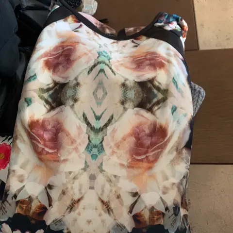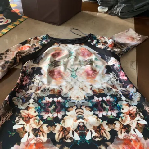 Vestido talla 10 marca Chris Mclaughlin, talla 10, con bonito y combinable estampado de flores, tela que estira, una sola puesta sin detalles, medidas axilas 47, cintura 44, cadera 52, largo 91, manga 40