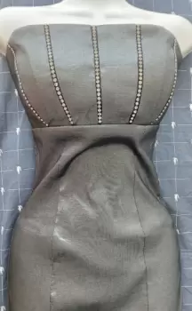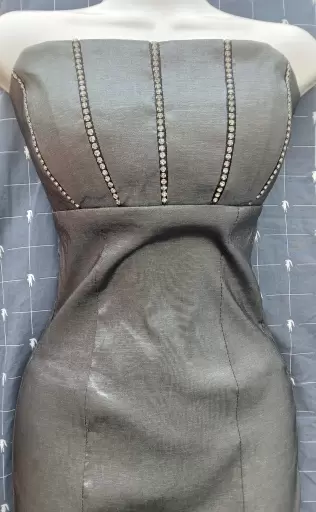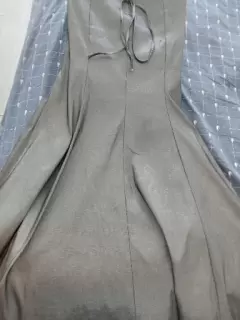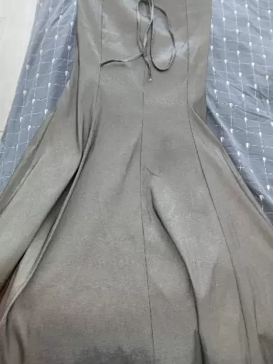 Vestido largo elegante color plata strapless con escote en la espalda, corte favorecedor en la cintura. Detalles brillantes al frente que resaltan y lucen muy lindos.