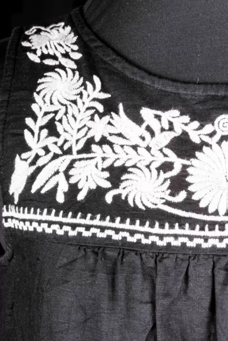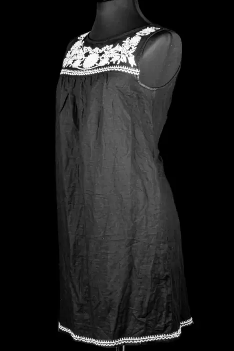 Vestido en color negro con bordado en blanco. Hermoso vestido negro suelto con detalle de bordado en pecho y línea final. Cuenta con forro interior para evitar que se transparente. Es talla S, pero puede quedar a M. Mide 46 cm de axila axila y 88 cm de largo.