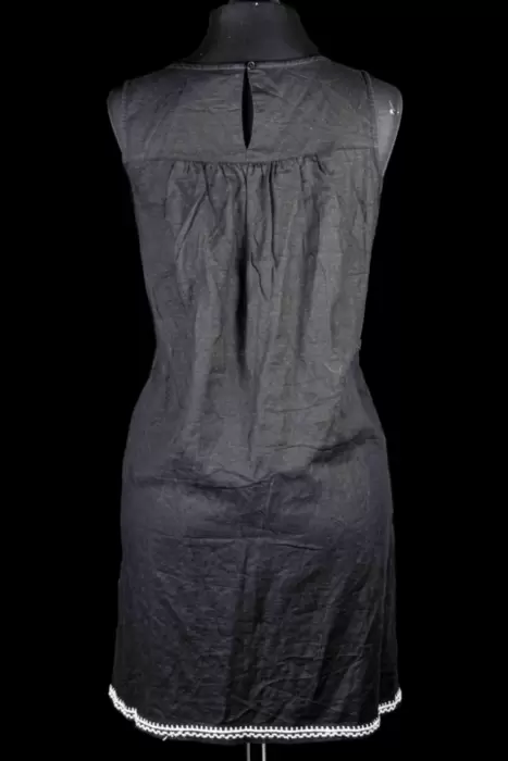 Hermoso vestido negro suelto con detalle de bordado en pecho y línea final. Cuenta con forro interior para evitar que se transparente. Es talla S, pero puede quedar a M. Mide 46 cm de axila axila y 88 cm de largo.