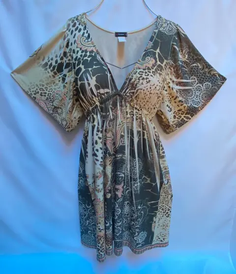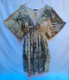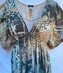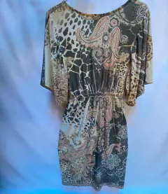 Vestido en licra y expandex, escote profundo en “V”, corte imperio elástico debajo del busto y plisado. Estampado monocromático. Manga kimono hombro caído. En vestido es suelto de la parte de enfrente.Talla: S (26-28) Puede quedar hasta una talla M.Marca: Cocomo.