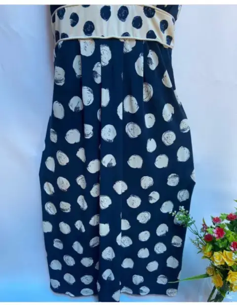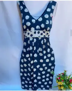 Vestido en poliéster y stretch escote en “V” ceñido a la cintura. Con pequeños tablones en la parte de adelante de la falda a la altura de la cintura. Talla: S (26-30) Marca: MERONA.