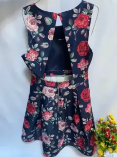 Vestido en tafeta satinada pinza de busto en corte francés. corte en cintura decoración de cinta, falda del vestido tablada y acampanada. En espalda presenta una abertura en triángulo desde el escote de la espalda Cierre de metal dorado en la espalda baja del vestido. Presenta una ligera rasgaduras superficial en la parte izquierda inferior de la falda.ultima foto Marca: MAIN STRIPTalla:L