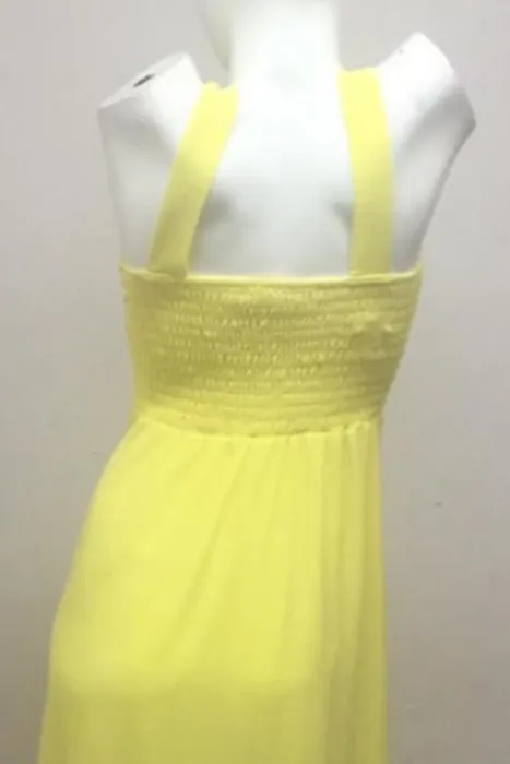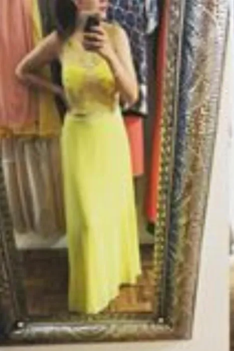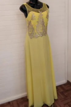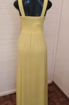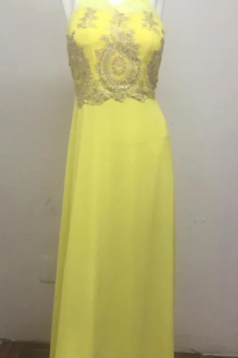 Vestido en Tono amarillo 1902-12. En la parte del busto tiene un poco de transparencia con bordado y pedrería, tiene copas y la parte de atrás tiene resorte lo cual estira para andar muy cómoda