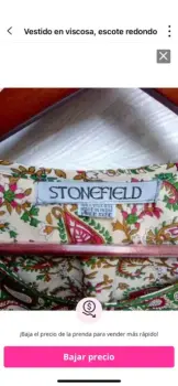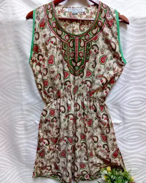 Vestido en viscosa, escote redondo estampado, fondo de la tela en color beige y decoración decoración de pequeñas hojas rojas. Corte a la cintura y elástico en ella, ribete en verde brillante alrededor de la sisa. Corte de la falda en una línea “A”.Talla: S (26-28) Queda hasta una talla mediana. Marca: ESTONEFIELD.