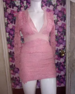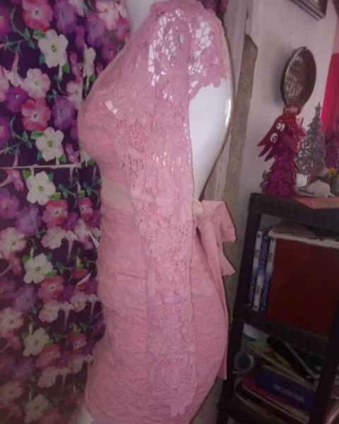 Vestido encaje. En talla chico solo una puesta es de manga larga y espalda escotada está corto llega como 3/4 de pierna está hermoso.