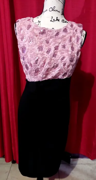 Vestido Enfocus Petite. Bonito Vestido tierno, con diseño asimétrico, entre rosa y negro, tiene costuras sobresalidas en forma de flores y lentejuelas, es de licra, totalmente nuevo, sólo que estaba guardado y no tiene etiqueta, no tiene detalle, tiene en la parte de la falda cómo abierta, está muy coqueto. Medida de axila a axila 88 cm sin estirar estirando 50 en circuferencia, de hombro a largo 102cm.